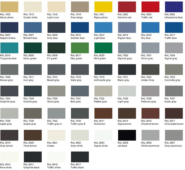 Please mention your required RAL number when ordering. If your required colour is not on the chart below, please check out the full colour chart RAL colours at this link https://www.ralcolor.com/ .